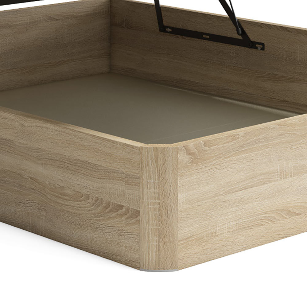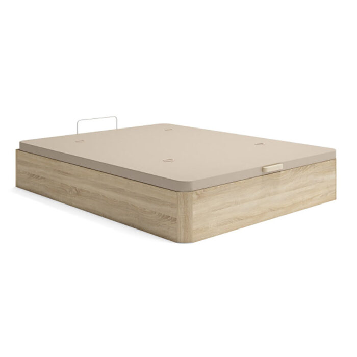Canapé abatible Grecia color roble cambrian 150 x 190 cm. Estructura interna fabricada con tubo de acero de 40*30, dos travesaños de refuerzo verticales de 30*30 y tablero perforado de 8 mm. Tapizado en tejido 3D acolchado en color vainilla con seis perforaciones. Tirador de madera. Sistema de apertura prolongada con desplazamiento mediante pistones de gas de 1150. Altura aproximada 6 cm. Frentes y costados fabricados en tablero de 22 mm. Fondo de tablero DM de 3mm. en acabado color vainilla, dos esquineras de CDM acabado melamina. Profundidad arcón de 28/29 cm aprox. Altura total con tapa cerrada: 35 cm aprox.