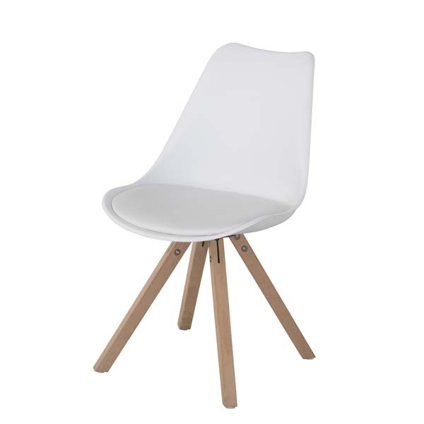 Precio pack de 4. Es necesario comprar el pack completo. Para otras cantidades, por favor, contacta con nosotros. Silla fabricada en polipropileno, con asiento tapizado en polipiel y patas de madera de haya. Disponible en color blanco y gris. Se sirve en cajas de 4 unidades. Medidas: 54*48*83 cm.