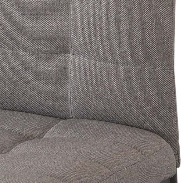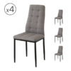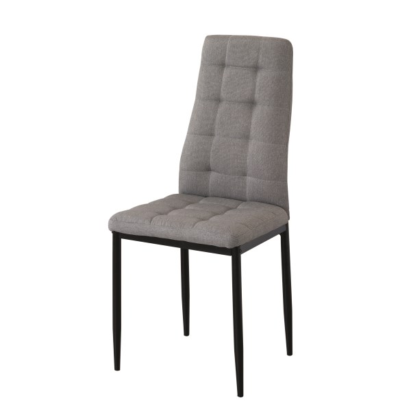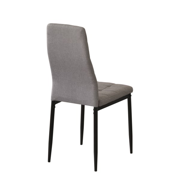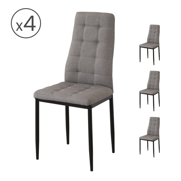 Pack 4 uds. Es necesario comprar el pack completo (4 uds). Para otras cantidades, por favor, contacta con nosotros. Silla tapizada en tela gris jaspeada con costuras para acolchado en respaldo y asiento. Patas metálicas en color negro. Se sirve en cajas de 4 unidades. Medidas: 43*56*96 cm.
